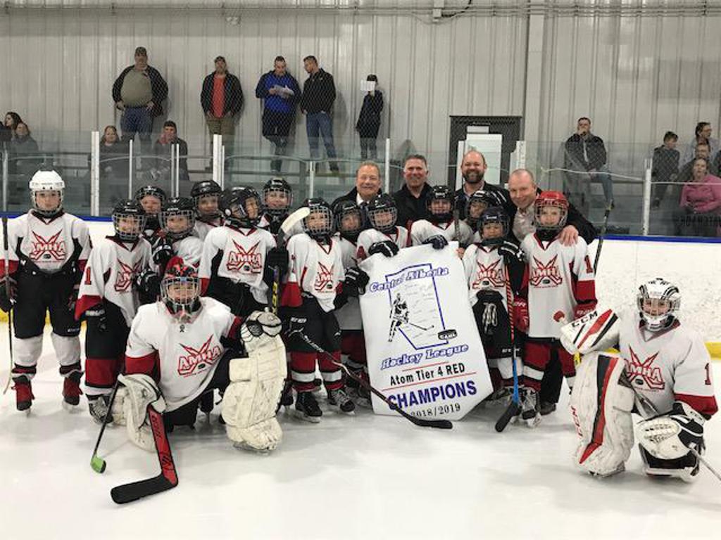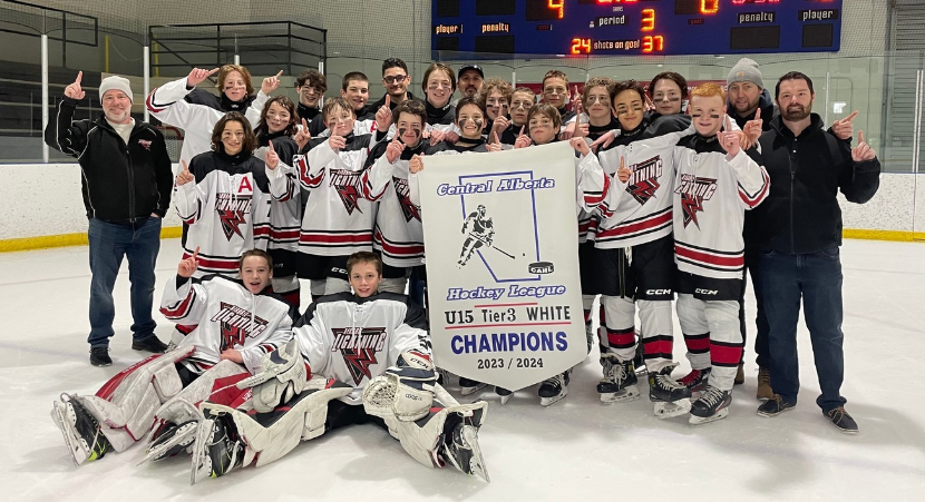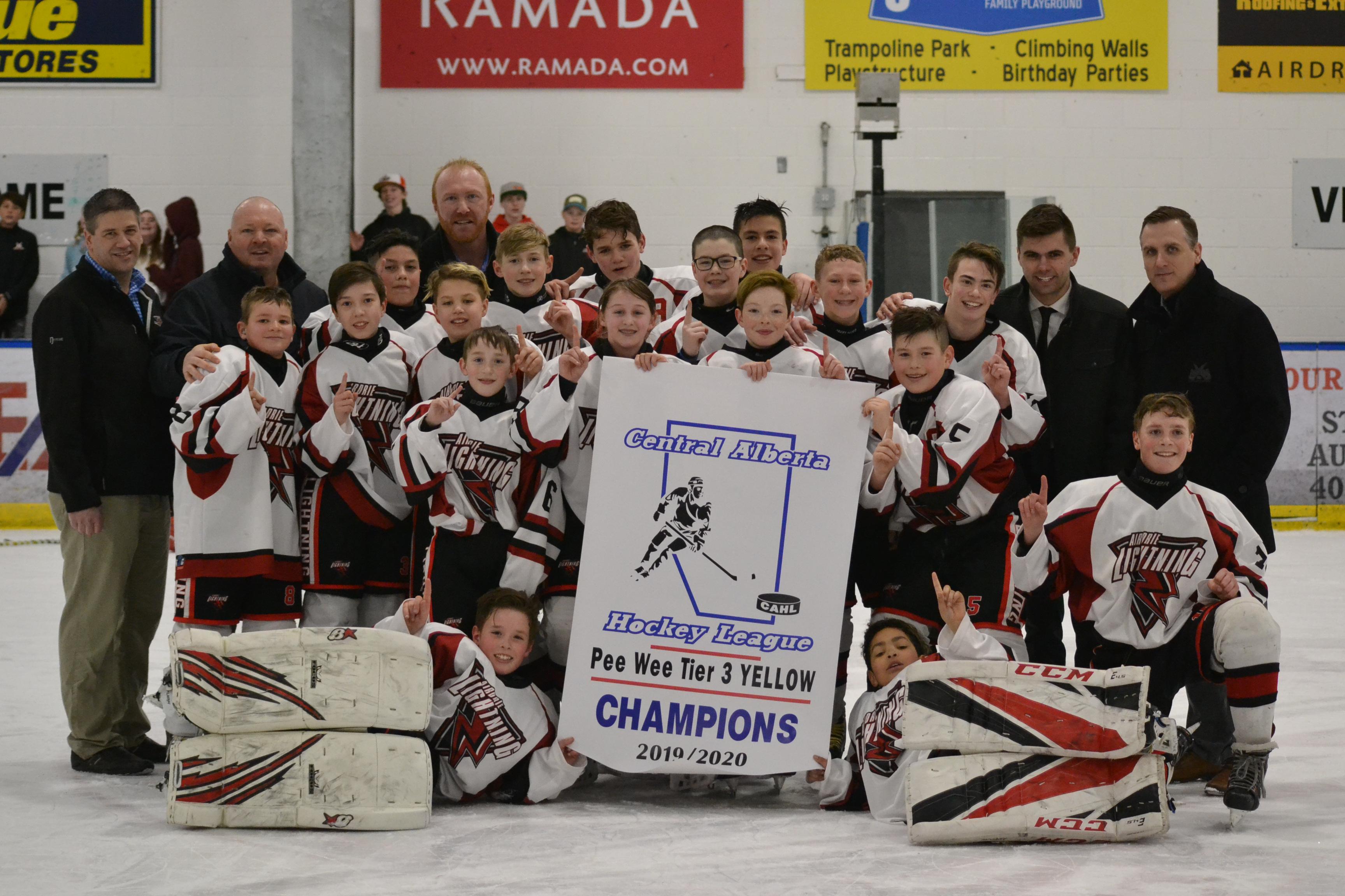 Congratulations to the Pee Wee Tier 3 Yellow who finished the Regular season in 2nd place, one point behind the first place team. During Playoffs, they were able to beat out the first place team and win the Central Alberta Hockey League Pee Wee Tier 3 Yellow Banner.