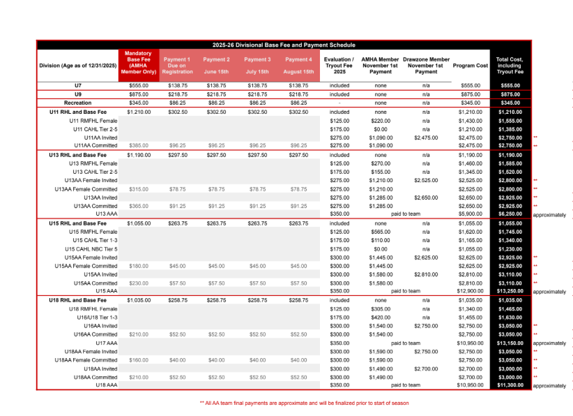 This year, you will need to select which team(s) you want to tryout or be evaluated for first and then the applicable Division Base Fee will be added to your registration, where you will be able to make payments based on the payment schedule below.