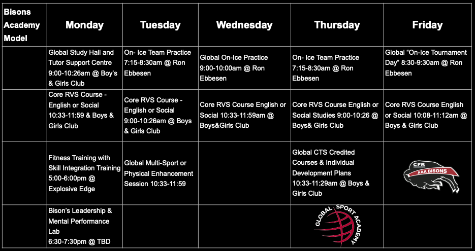 All Bisons have the option of choosing the Bisons Basic Model or the Bisons Academy. The model is Hockey Alberta compliant and provides families with individual choice. Below is a sample schedule of the Academy Model: